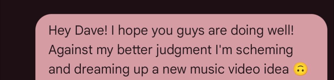 As you can see, I really did not want to make a video. I haven’t felt able to capture the things I imagine, largely due to lack of skill. As Ira Glass once said: “...your taste is why your work disappoints you.” I hate coming up against something I can’t DIY & willpower my way through. Enter Dave.